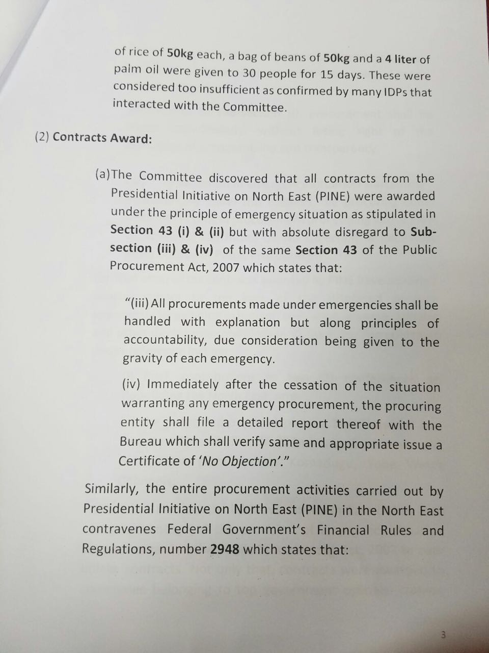 According to the committee, chaired by Senator Shehu Sani, most of the contracts awarded by Presidential Initiative on the North East (PINE) have no direct impact on the lives of the displaced persons who are still languishing in a squalid condition, hunger, disease and other deplorable conditions in all IDPs camps.