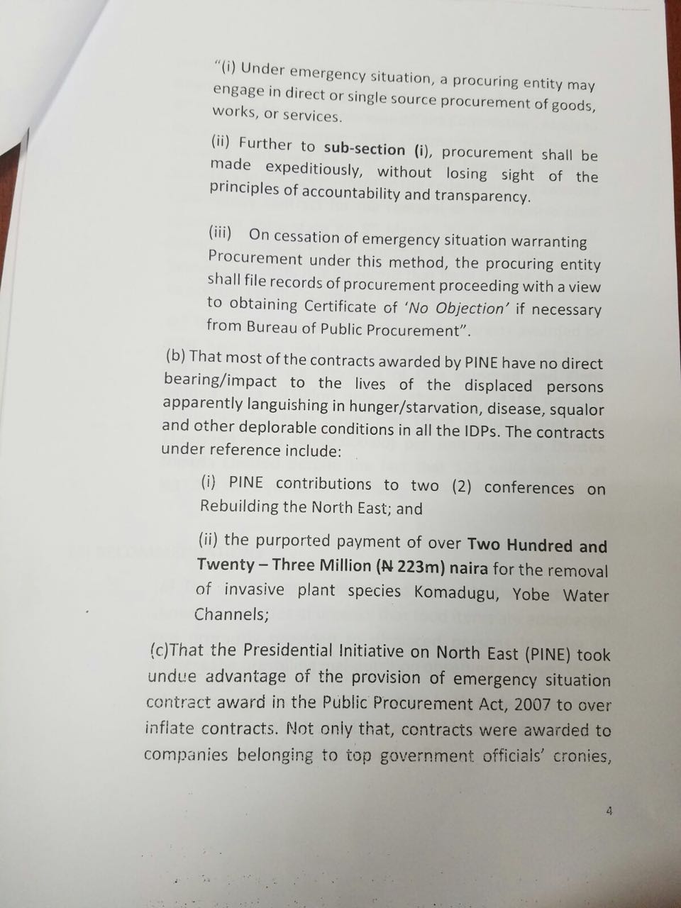 The committee pointed out that such contract includes PINE contribution to two conferences on rebuilding the North East and the payment of N223m to Rholavision Engineering Limited for the removal of invasive plant species from komadugu,Yobe water channels.